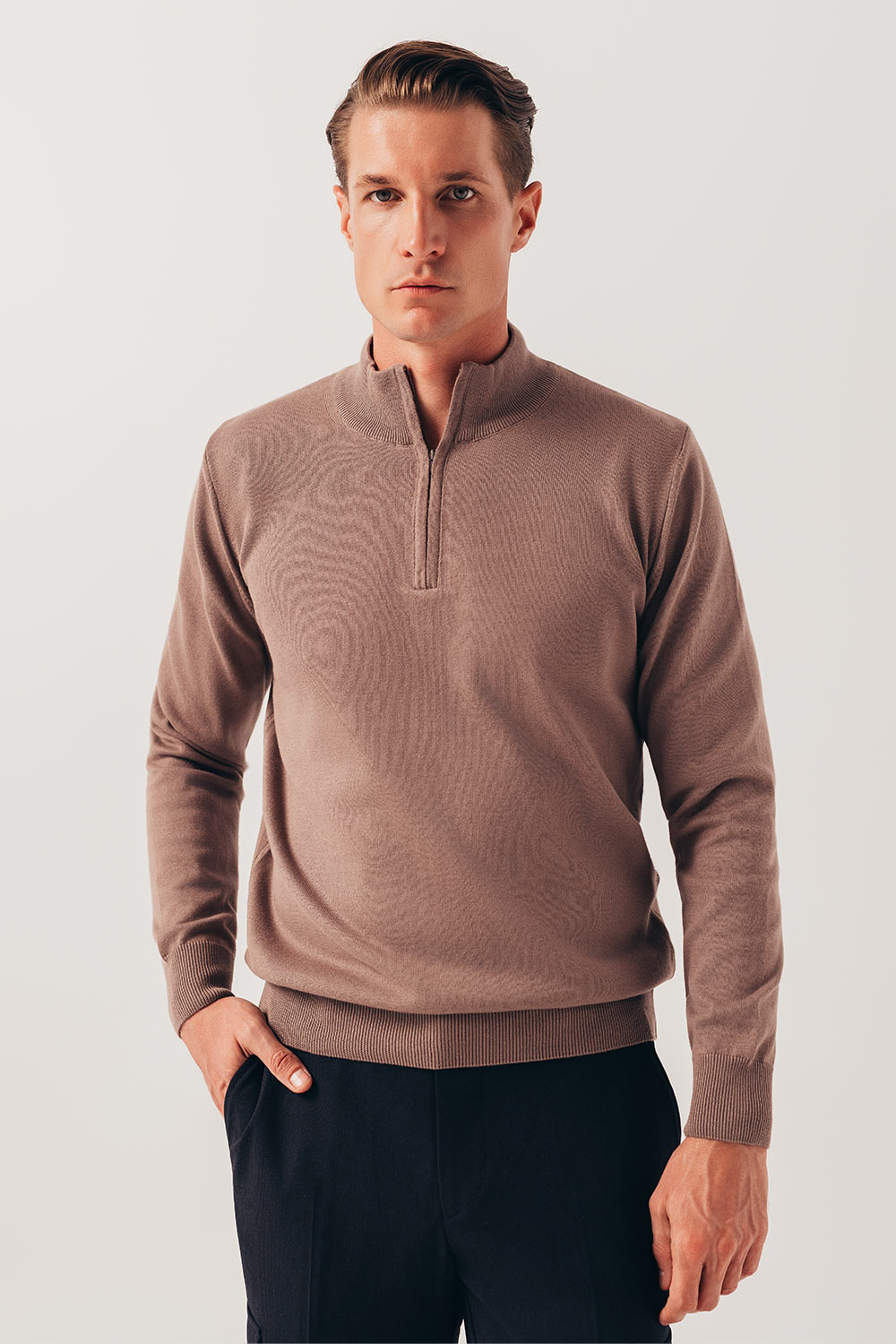 Garinello half zip džemper je neizostavan deo vašeg garderobera. Izrađen od ekstra finog pamuka. Praktičan za kombinovanje. Odlično se uklapa uz majicu, košulju, pantalone ili farmerke. Pogodan za svaku priliku. Sitne rebraste ramfle na rukavima i donjem delu.