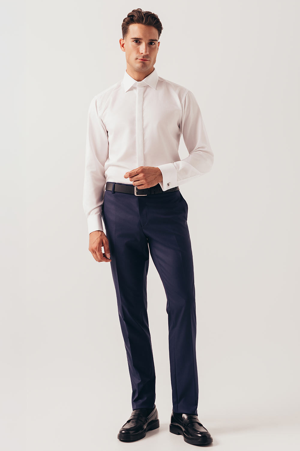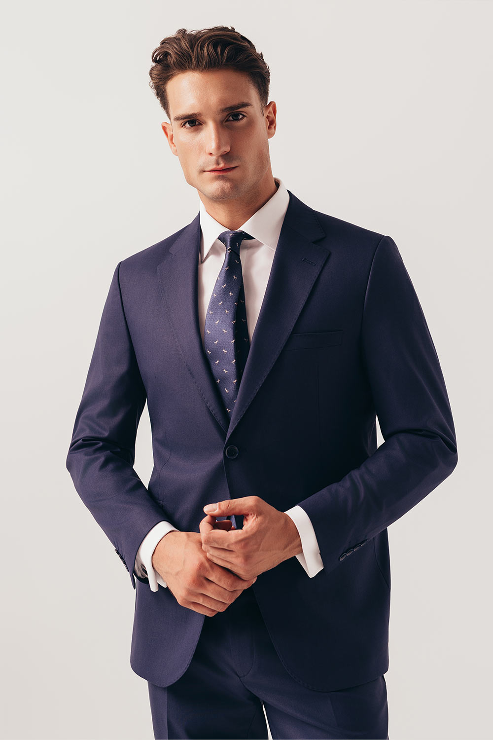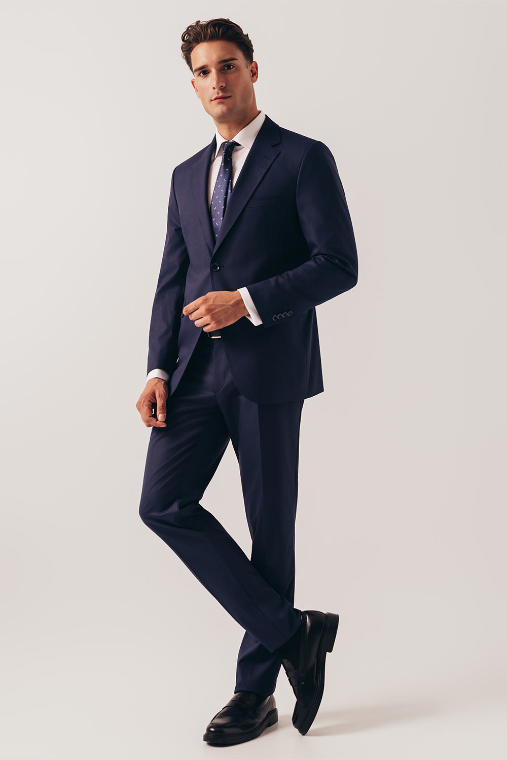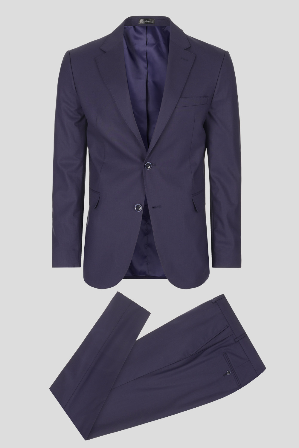 Garinello lagano odelo klasičanog kroja, odmerenih i elegantnih linija koje nikad neće gubiti na aktuelnosti. Jednoredno kopčanje sa dva dugmeta, proštepani reveri, paspulirani džep u nivou grudi, prednji džepovi na preklop, tri džepa sa unutrašnje strane i dva šlica na zadnjoj strani. Osećajte se sofisticirano i sigurno u svakoj prilici.